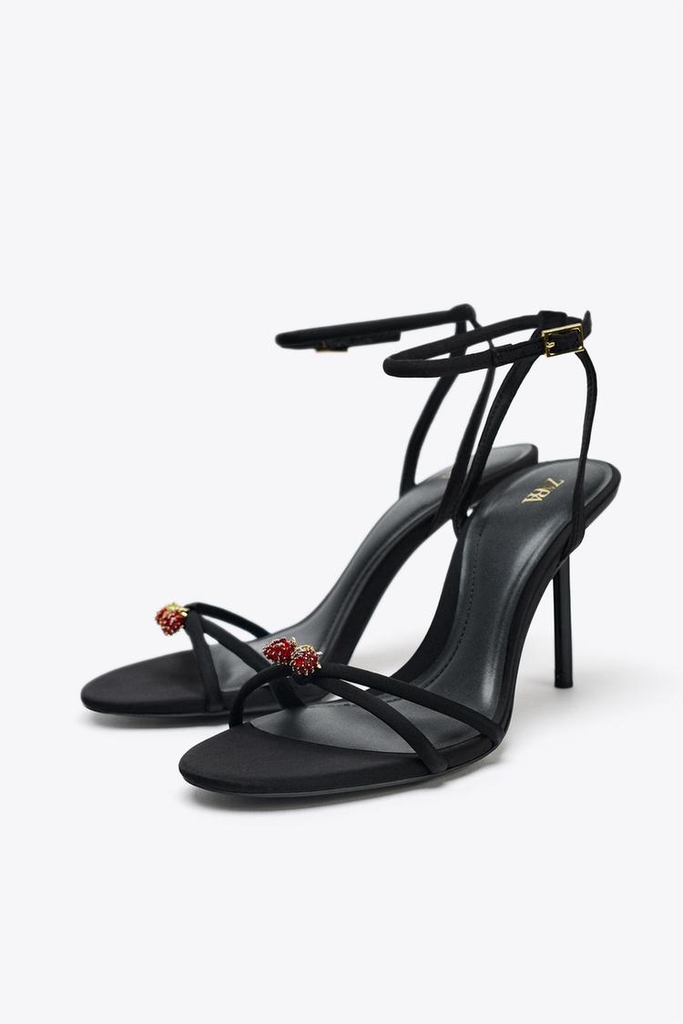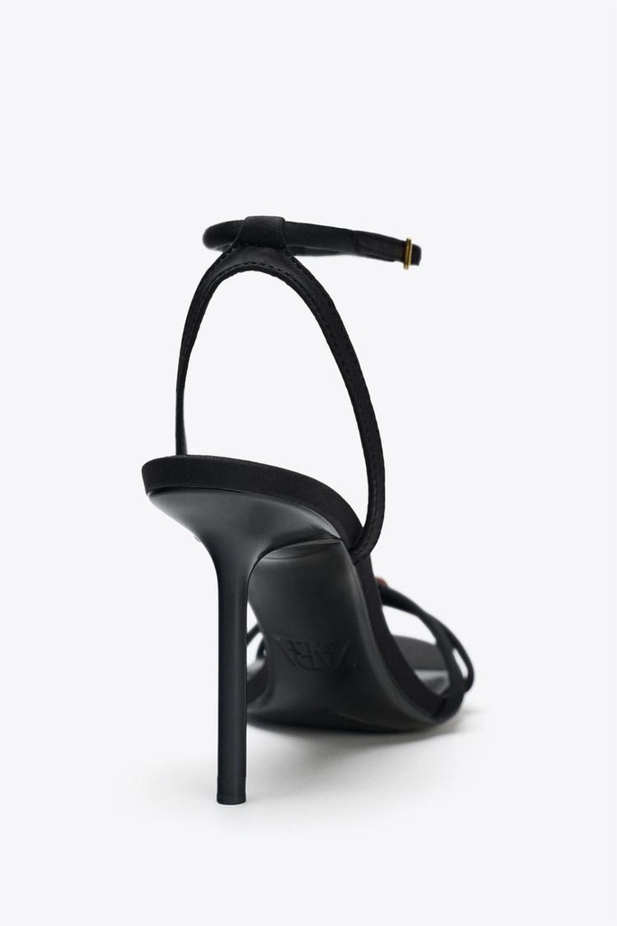 Giày sandal cao gót. Quai chéo phía trước đính hạt kim loại. Gót nhọn cao. Quai sau ở mắt cá chân và khóa kim loại. Mũi tròn.