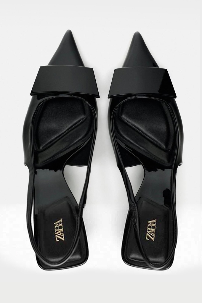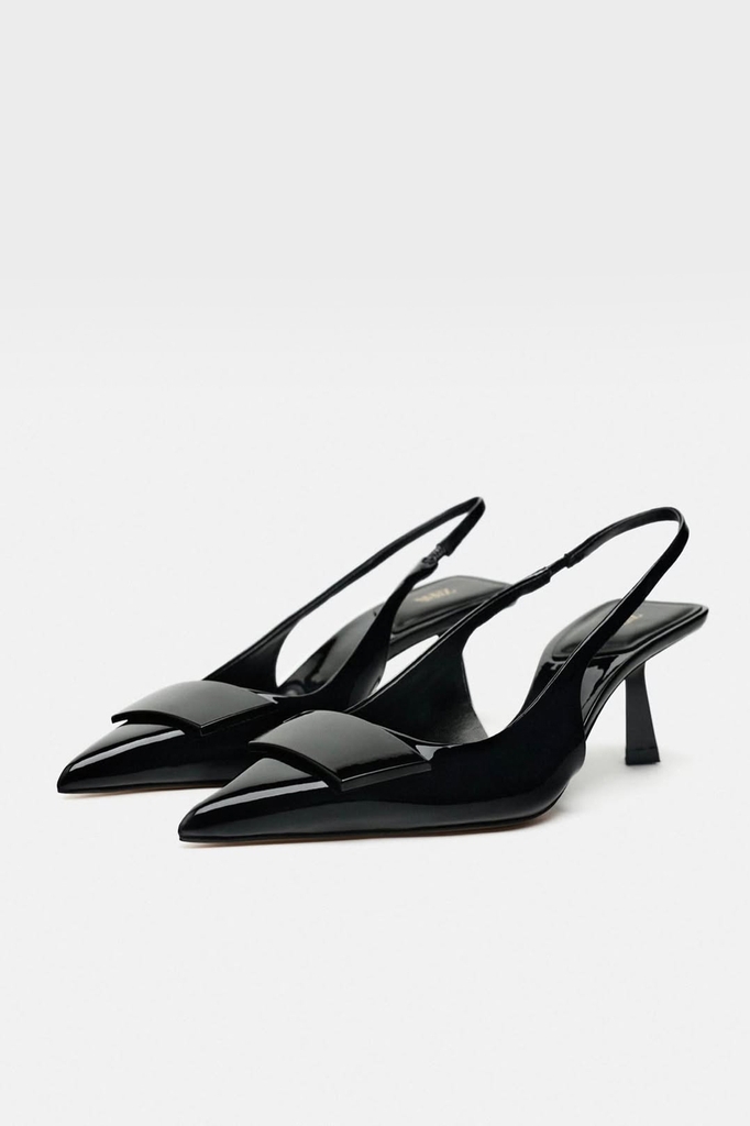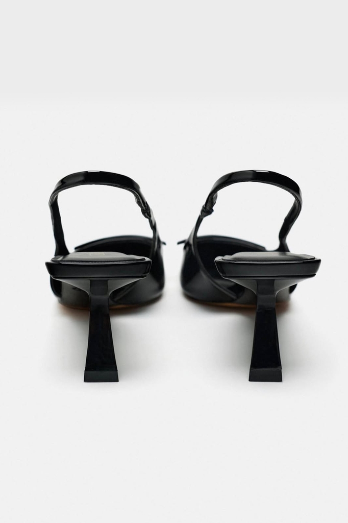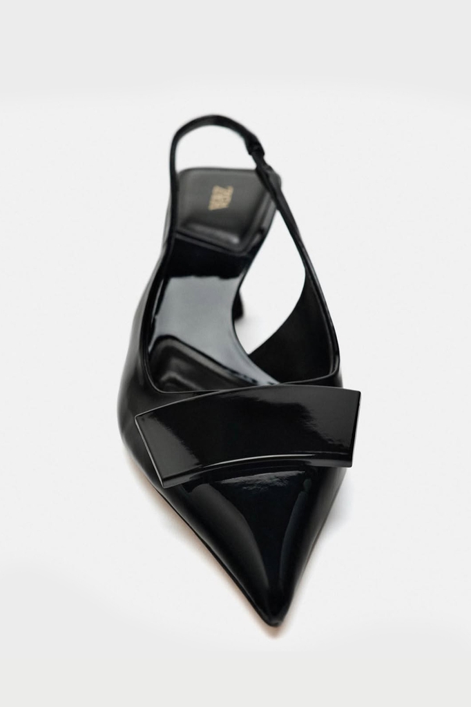 Sandal cao gót có chi tiết bản trang trí to bản phía trước mũi giày. Quai hậu dạng slingback ôm gót