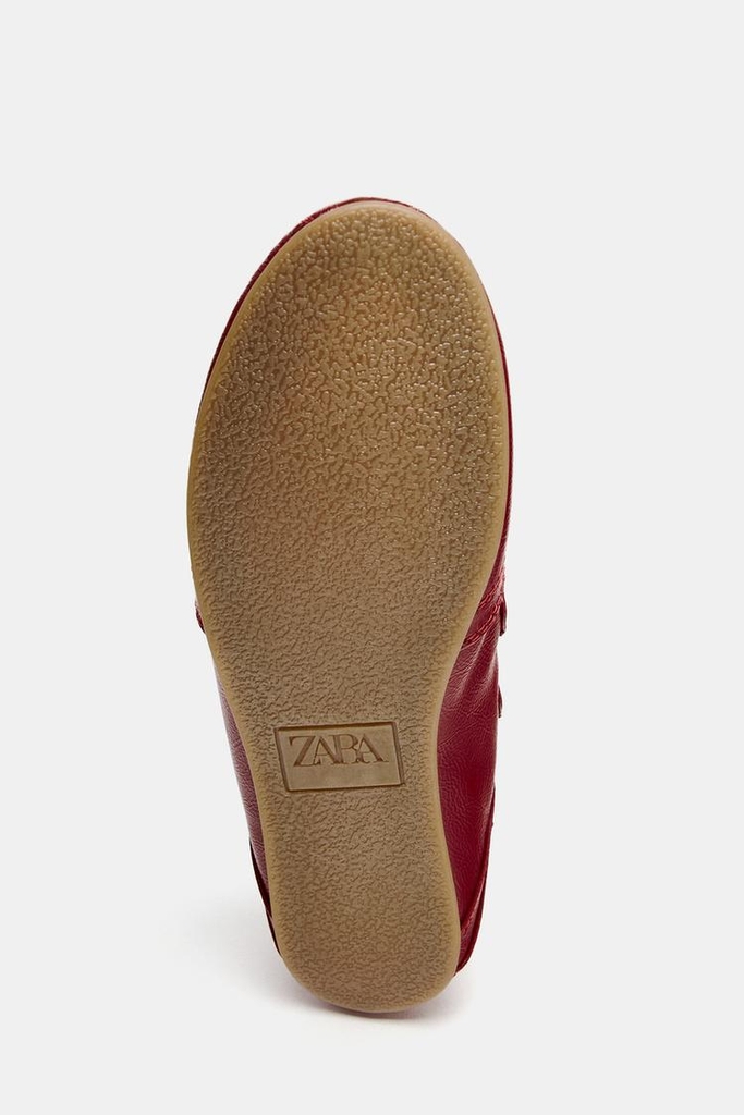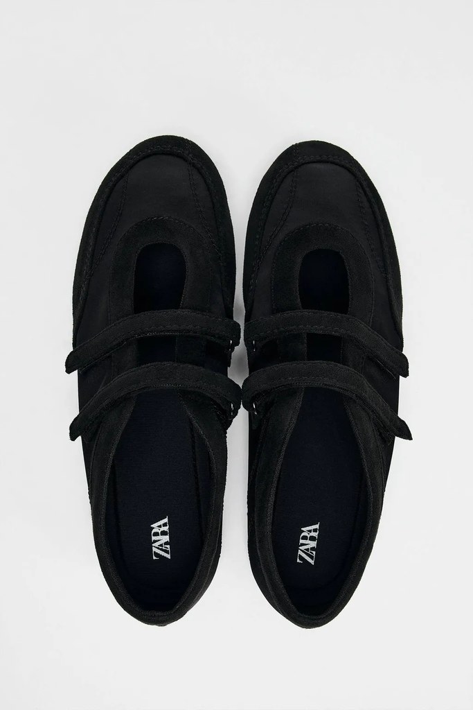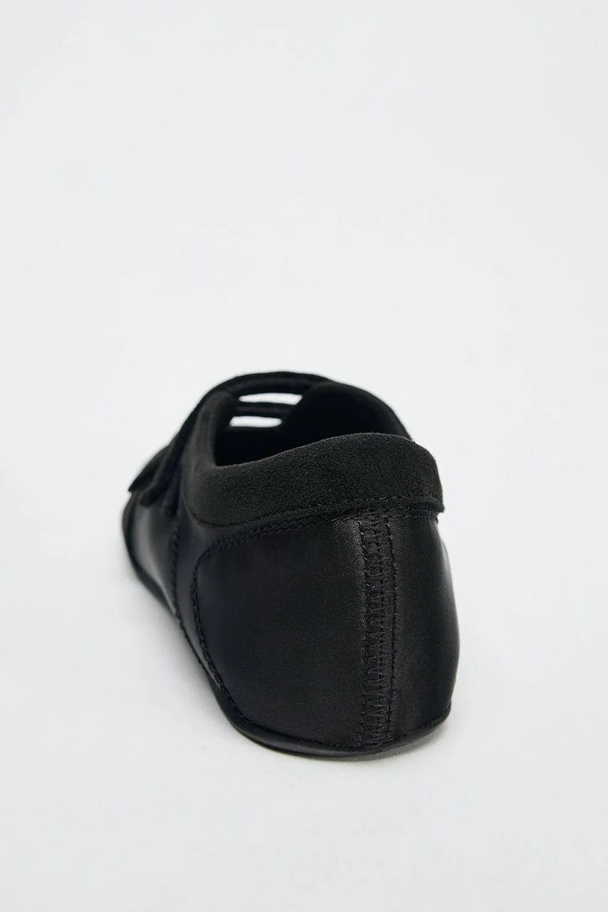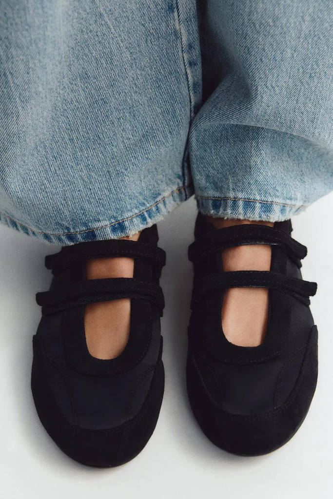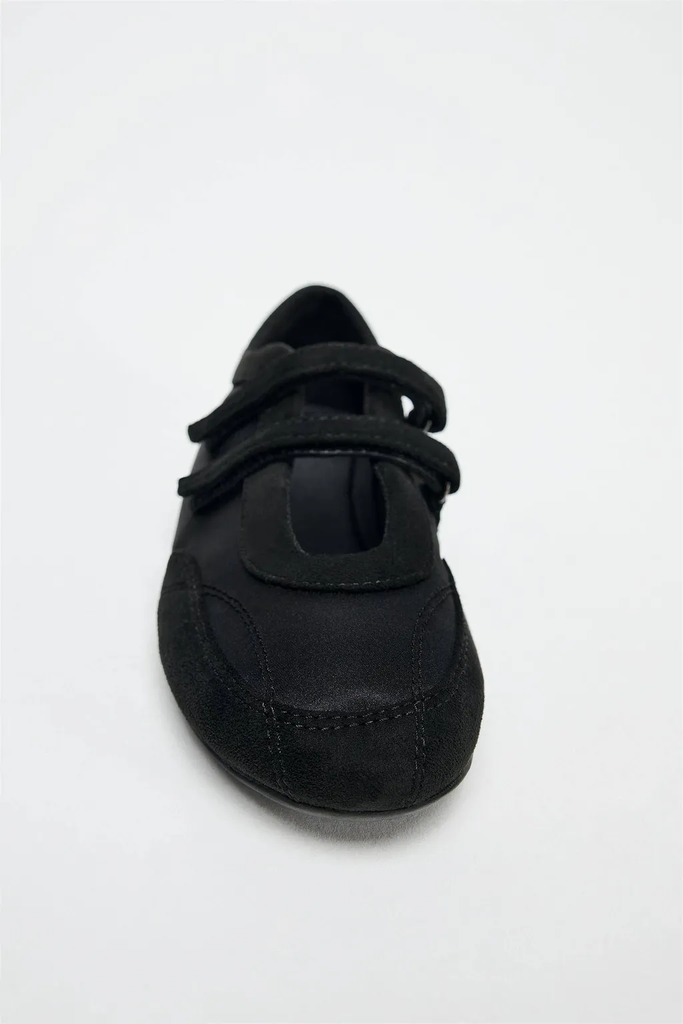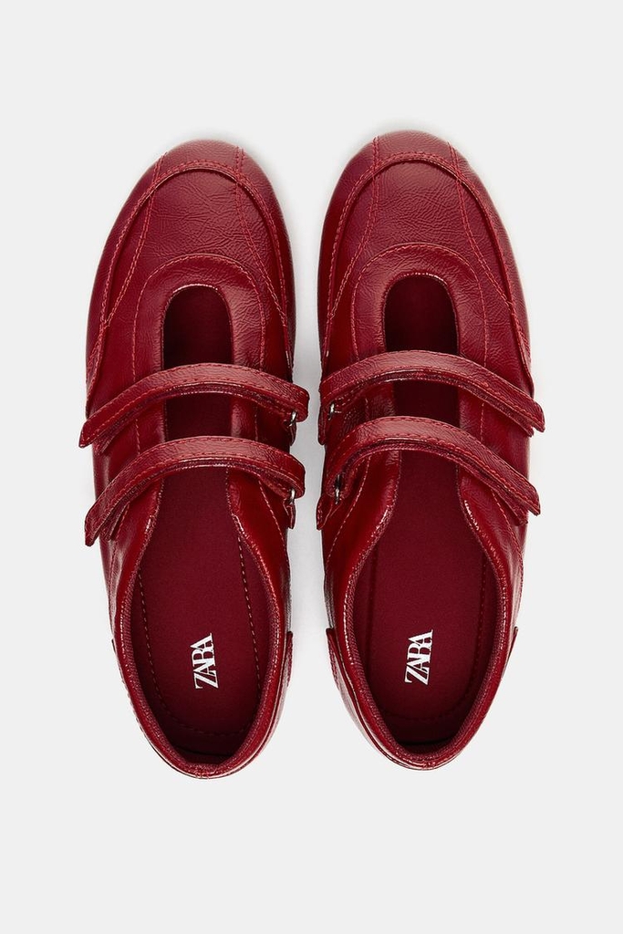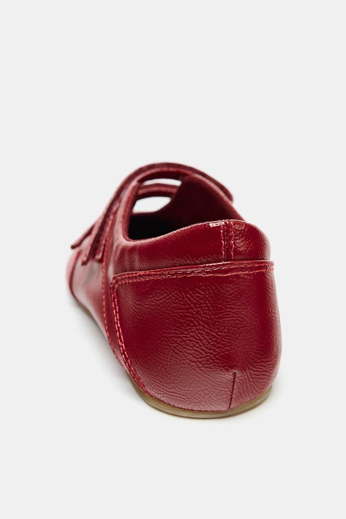 Giày ba lê hiệu ứng Patent. Quai dán đôi có thể điều chỉnh ở phía trước. Mũi giày bo tròn.