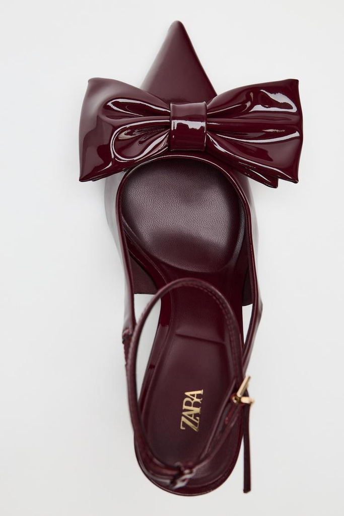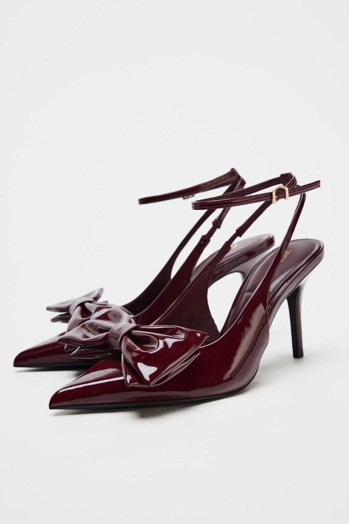 Giày cao gót nhọn. Chi tiết nơ nhung Maxi. Khóa cài ở quai giày mắt cá chân. Mũi nhọn.